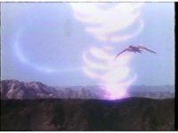 Pterodactyl Dinozord flies to our left along mountainous terrain, suddenly gets struck by lightning, and morphs into Firebird Thunderzord. |