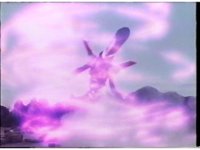 RDTZWM, still spinning red-trailing staff, swoops down right into us, leaning back, eyes flashing, it slashes its right arm forth across the screen, as the background flares into a bright spectrum. |