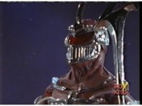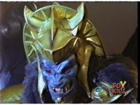 Standing on balcony, with Goldar cheering him on, Lord Zedd switches staff to right hand, looks at left, creates a growth grenade, then pitches it over the railing, causing flashing of light. |