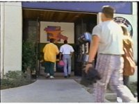 Close on the outer entryway to the Youth Center, as a white-shirted guy walks out to our left, while a purple-bag holding guy enters. |