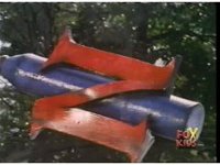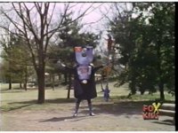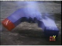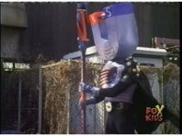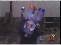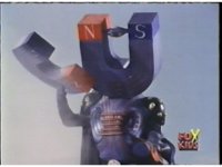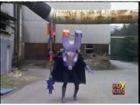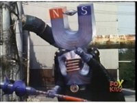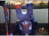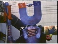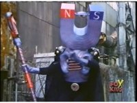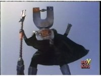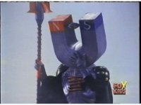 Zoom out as Magnet Brain pulls a horseshoe-shaped magnet out from his face, and holds it up like a weapon, while crossing to our right while Thunder Megazord passes to our left in foreground. |