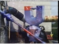 Close-up on red-N end of Magnet Brain's staff coming into frame and turning so we can see it. |