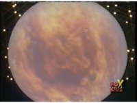 Lord Zedd stands beside his throne, back to us, looking at the cut-out of Earth, emitting his eyebeam, which soon halts and he begins to turn. |
