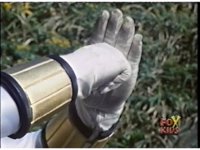 Close-up of White Ranger's hands coming into frame, facing our right, and pounding fist to palm. |