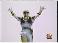 Upward angle, against white backdrop, White Ranger, whips arms around doing a whole bunch of poses, before finally motioning hand from chest to outward. |