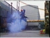 Close on Blue Ranger, crossing arms in front of face before posing down in a crouch, then another to our left. |