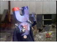 Close on Magnet Brain as he tosses horseshoe-shaped magnet to our left. |