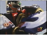 In Thunder Megazord cockpit, zoom out fully after the Rangers, in unison, release controls, thrust elbows out to sides, then cross right arms to left shoulders, then outward in slashing motion. |