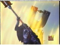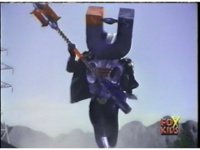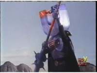 Zoom out from helmet, as Blue Ranger holds both ends of Power Lance in the air, then throws them upward. |