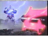 As magnet staff's red-N tip comes into frame, flips around, and glows red, Thunder Megazord's chest magnet glows blue, causing bluish electricity to crackle about, until it and everything around spark bursts brightly. |