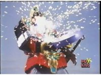 Close on Thunder Megazord as it grabs each side of chest magnet, and pulls, sparkily snapping it in half. |