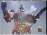 Zoom out from the Lion head crotch piece over the Firebird waist, as Thunder Megazord poses with fists out at sides. |