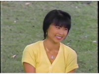 Close on Trini, as she turns from our left to smile widely to our slight right. |
