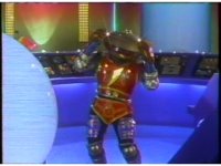 Distant shot near/behind Viewing Globe, as Alpha 5 watches it, jerking arms up and down while talking, then turns around to Zordon for a moment, then back to globe, talking and fretting. |