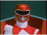 Close on Red Ranger in Thunder Megazord cockpit, raising right fist and pumping it down at elbow level. |