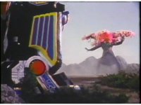 As Thunder Megazord turns to face us and holding saber down and outward, Terror Blossom falls on his back behind it, and explodes into a bright, spark-filled explosion and smoke eruption, spewing one last, huge swath of pink petals everywhere, which finally prompts the Megazord to prepare to resheathe saber. |