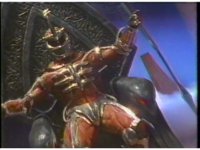 Left-tilted crooked angle, push into throne room through entry hall as six Z-Putties make their way to the throne, which slowly rotates to show Lord Zedd, sitting on it, arms spread out. He lowers staff horizontally across the arms of the chair, leans forth, and flashes visor. |
