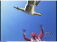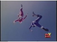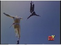 Yellow and Black Rangers fall from the sky, kicking their feet and grabbing at the air. |