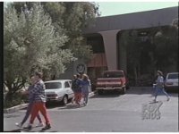 Slow zoom on Youth Center exterior parking lot, as a teen couple walks behind a pair of girls, another couple walks to our right, and a girl head across from right. |