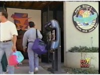 Close on the outer entryway to the Youth Center, as a white-shirted guy walks out to our left, while a purple-bag holding guy enters. |