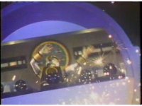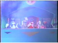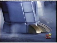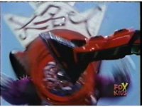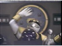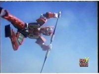 In Thunder Megazord cockpit, zoom out fully after the Rangers, in unison, release controls, thrust elbows out to sides, then cross right arms to left shoulders, then outward in slashing motion. |