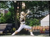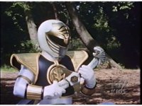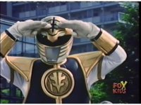 Zoom out from White Ranger's chest symbol, as he lands on his right foot, then poses, reaching out, Saba in other hand. |