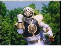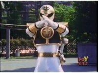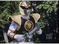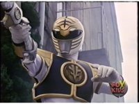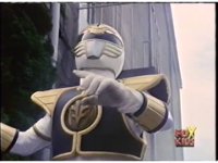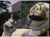 Close on White Ranger, looking to our right, nodding then turning to our left, raising his index finger and shaking it. |