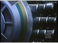 Close-up on side cannon-back rounded areas of Tor suddenly spinning its internal gyro until a set of five jet fingers pop out. |