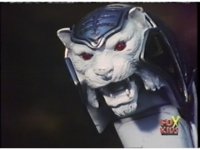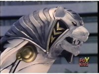 Against pure white backdrop, White Tiger Thunderzord's head comes quickly into frame from our right, roaring. |