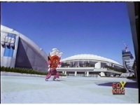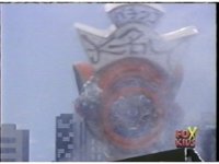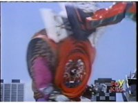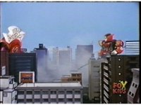 Facing each other across the damaged city, Thunder Megazord and Pachinko Head both pass to their respectively left. |