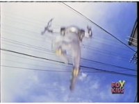 White Ranger lunges directly over the camera, under a bunch of power lines. |