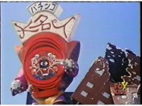 Close on Pachinko Head getting punched in the forehead by Thunder Megazord. |