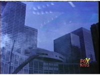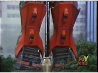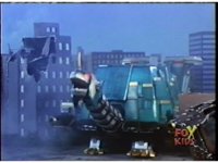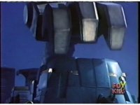 Yet another close shot of Thunder Megazord posing battle ready in the city, then marching forth to our slight right. |