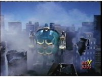 Through the smoke of the damaged city, Thunder Megazord poses, zoom out as it and Pachinko Head both pass to their respectively right. |