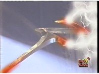 Pterodactyl Dinozord flies to our left along mountainous terrain, suddenly gets struck by lightning, and morphs into Firebird Thunderzord. |