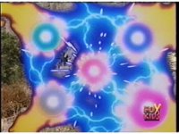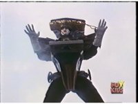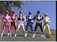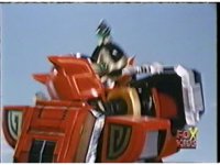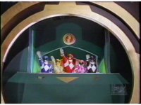 In Thunder Megazord cockpit, zoom out fully after the Rangers, in unison, release controls, thrust elbows out to sides, then cross right arms to left shoulders, then outward in slashing motion. |