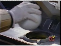 Distant shot near/behind Viewing Globe, as Alpha 5 watches it, jerking arms up and down while talking, Zordon silent in background. |