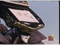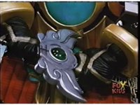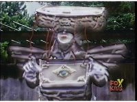 Slow zoom out as Zedd, standing on balcony, facing our slight right, jolts out of red vision beam, then backs up, and twirls his staff around completely, talking, as Squatt & Baboo hang around with the Z-Putties in the far background. |