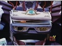 Freeze frame on green chest gem, as the five Power Rangers in the Megazord cockpit superimposes within, as they reach out and up with their right hands, then gesture them around into fists, before grabbing controls. A bright flash erupts to conclude it, engulfing the screen. |