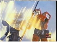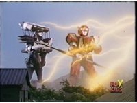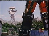 Close on Thunder Megazord, blocking staff with one hand, then punching it down, pan left as it reaches over and grabs Copyzord by its neck. |