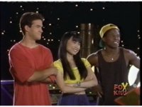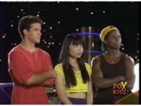 Jason, Trini & Zack look upward at Zordon, as Trini glances to our right, smirking. |