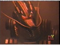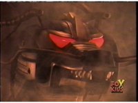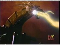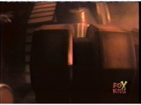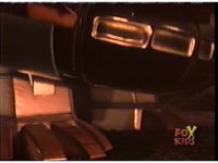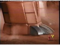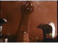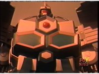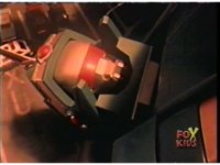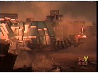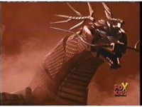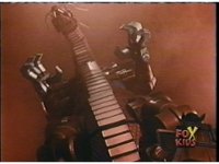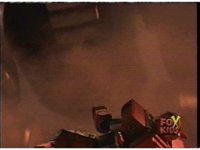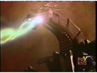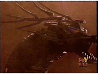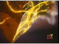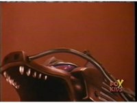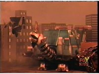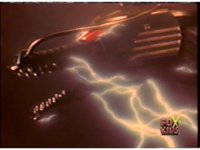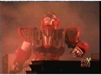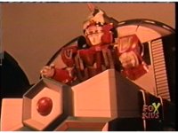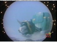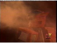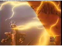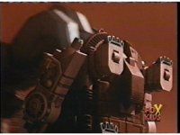 Glowing, expanding blob turns into Tor the Shuttlezord, jerking neck, snapping mouth, and stomping feet as shot zooms in. |