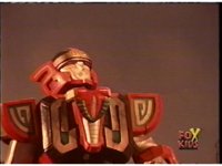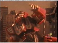 Red Dragon Thunderzord flies through the sky, crackling with bluish electricity, and transforms into Warrior Mode, soaring to our left. |