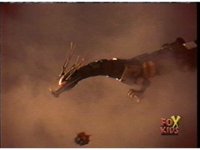 Downward angle on Serpentera, curling through the clouds, as the small Thunderzord Assault Team sled passes it on the left. |