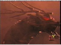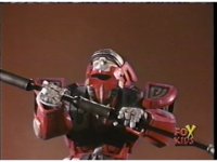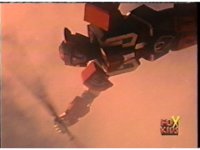 Thunderzord Assault Team swoops past the camera, doing a barrel roll to its right. |