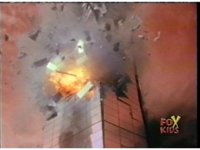 Close on mirrored-windowed-wall of building, as it explodes outward with dust. |