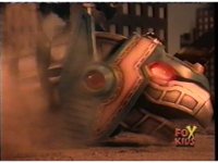 Tor's turtle head, having reverted back into control, activates as it hits the ground, dust knocked up. |