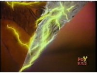 Close on floating upsidedown pyramid thing with the eye, as it crackles with yellow electricity and dust bursts. |