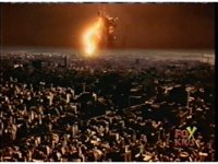 Serpentera stands in the distance, facing the crowded city, firing yellow electricity into the ground, then stopping. A rapid flash of light heralds an expanding ring of destruction, spreading out across the city, spewing red death skyward amid debris, as it ripples out from the spot Serpentera struck. |