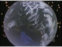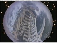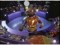 Distant shot near/behind Viewing Globe, as Alpha 5 watches it, jerking arms up and down while talking, then turns around to Zordon for a moment, then back to globe, talking and fretting, then back to Zordon. |